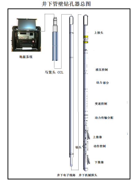 管壁鉆孔器在管子內部工作,絞車下放鉆孔器到作業(yè)深度,通過地面可視計算機界面發(fā)出推靠扶正命令,儀器向管壁一側靠緊,動力機構旋轉,帶動鉆頭鉆進管壁,鉆進過程中傳感器反饋鉆頭位置到地面計算機監(jiān)控界面,鉆頭鉆透管壁地面發(fā)出退鉆命令,鉆頭回收進儀器,推靠臂回收,完成一次造孔作業(yè)??芍貜湾^定,多次造孔。